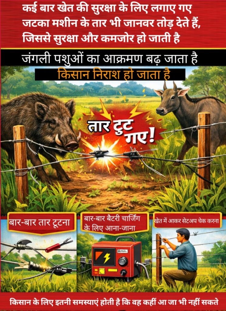 कई बार खेत की सुरक्षा के लिए लगाए गए जटका मशीन के तार भी जानवर तोड़ देते हैं, जिससे सुरक्षा और कमजोर हो जाती है।